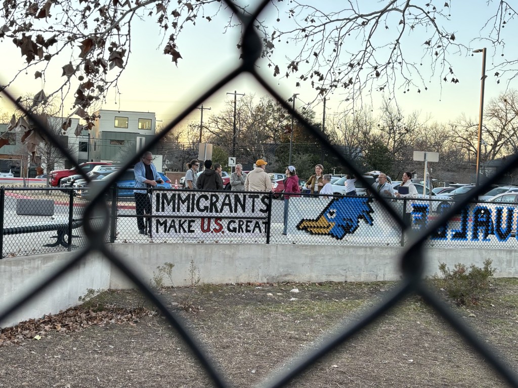 A community-made sign with “Immigrants Make U.S. Great” written out is displayed in front of Govalle Elementary School on February 5, 2026. Photo by Brianna Chavez/Austin Vida