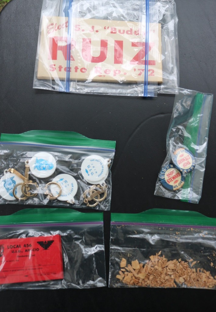A collection of mementos on one table included campaign materials, strike buttons, union memorabilia and even sawdust from the factory floor.