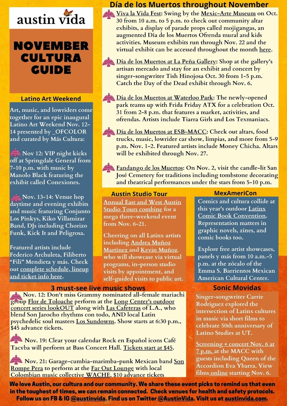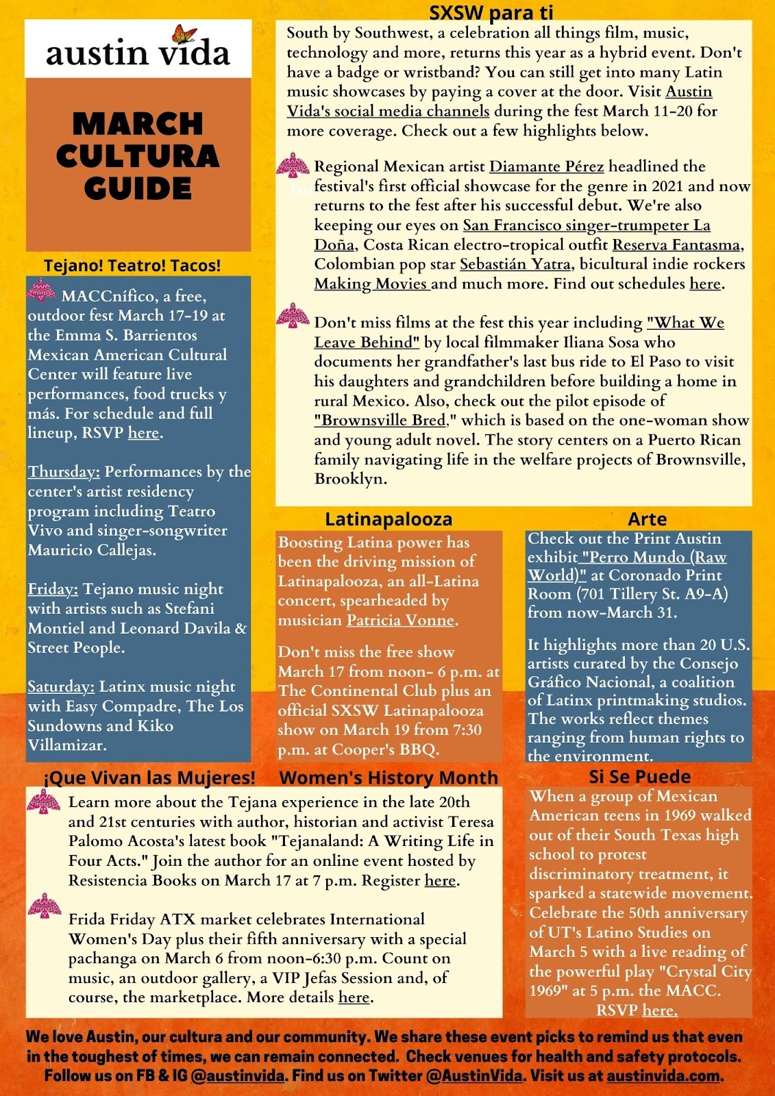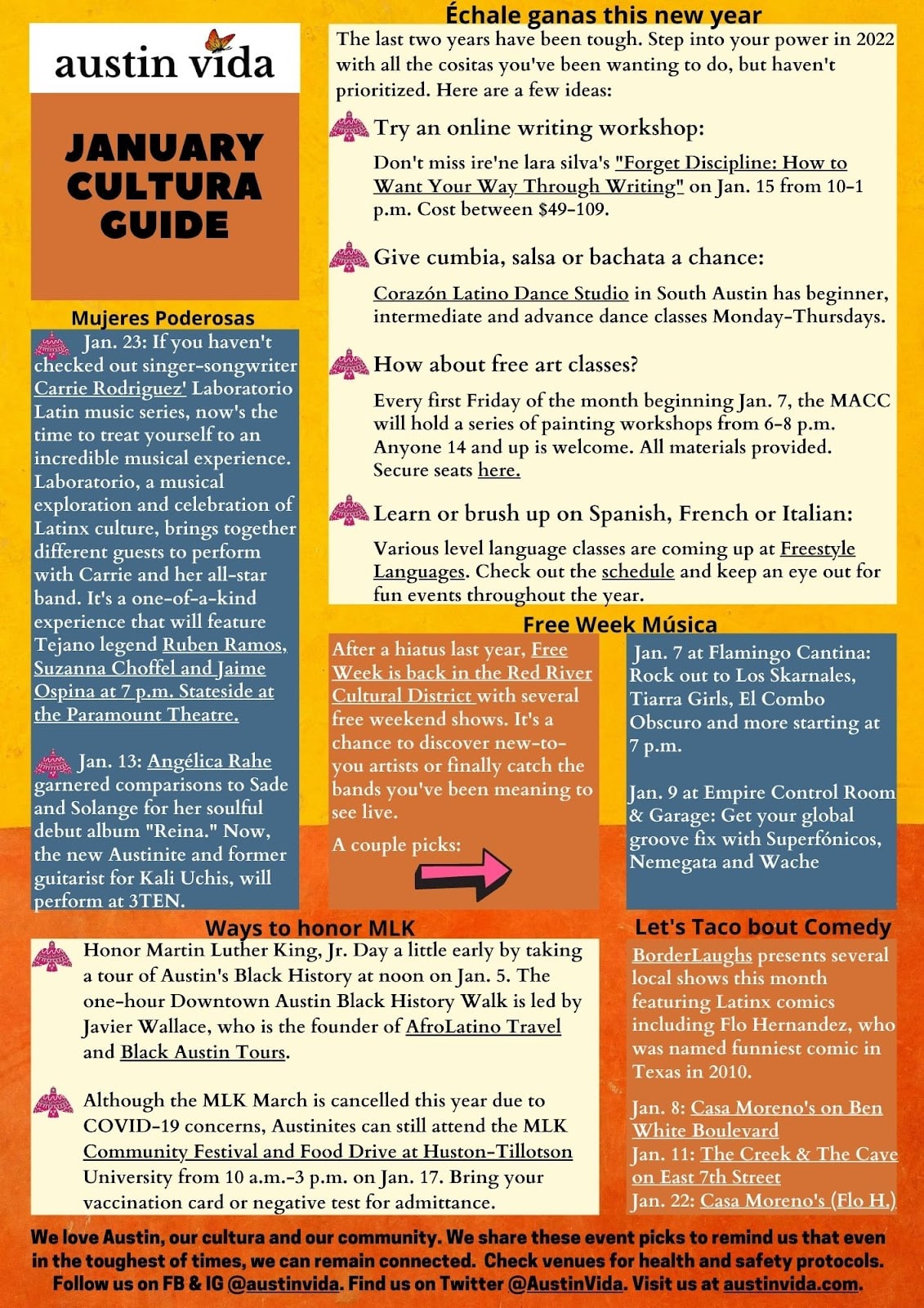 Austin Vida Cultura Guides Check out a sampling of previous cultura guides. To get this month’s free Cultura Guide, simply sign up! Look for the orange sign-up box at the bottom of this article or on homepage. By Austin Vida staff ● Cultura Guides ● April 5, 2022 Sign up now to get instant access to Austin Vida’s latest Cultura Guide, featuring local cultural happenings focused on Austin gente. Email info@austinvida.com if you have any issues. Sign Up Sign up for your free Cultura Guide ✨ ✨ Author Austin Vida staff Related Articles March 2026 Cultura Guide By Austin Vida staff ● Cultura Guides ● March 4, 2026 Find the top March 2026 Latino events in Austin. February 2026 Cultura Guide By Austin Vida staff ● Cultura Guides ● February 5, 2026 Find the top February 2026 Latino events in Austin. January 2026 Cultura Guide By Austin Vida staff ● Cultura Guides ● January 6, 2026 Find the top January 2026 Latino events in Austin.