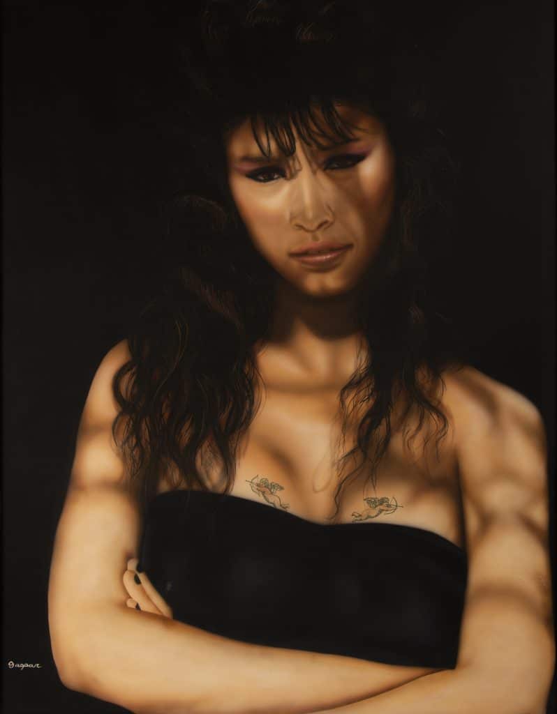One heartwarming portrait, “Ofrenda para Antonio Lomas,” by Carmen Lomas Garza, depicts the artist’s late grandfather gardening in a steel medium that resembles papel picado. At one side of the portrait, “La Morena,” by Connie Arismendi, shows a woman’s face in a veil. “When she [Arismendi] saw the two portraits together, she got so emotional,” said Garcia. “She was touched because Carmen Lomas Garza was an inspiration to her,” added Davidson.